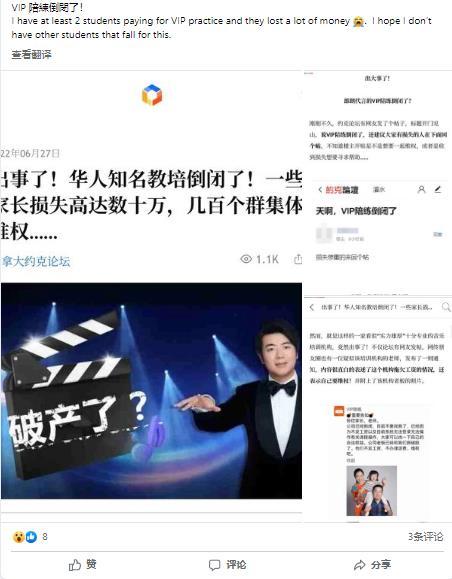 有網友在FB發帖表示,他至少有兩位學生因「VIP陪練」倒閉造成不少損失。有學生家長表示,該陪練平台代言人是鋼琴家郎朗,形象正面。因此在平台花費逾2萬元人民幣,但不久就倒閉。亦有事主稱,在香港實體學習樂器的學費負擔較大,2019年於「VIP陪練」為孩子報樂器陪練課程,迄今花費3.4萬元人民幣。7月停課後,仍剩價值約1.5萬元人民幣的課時未用。