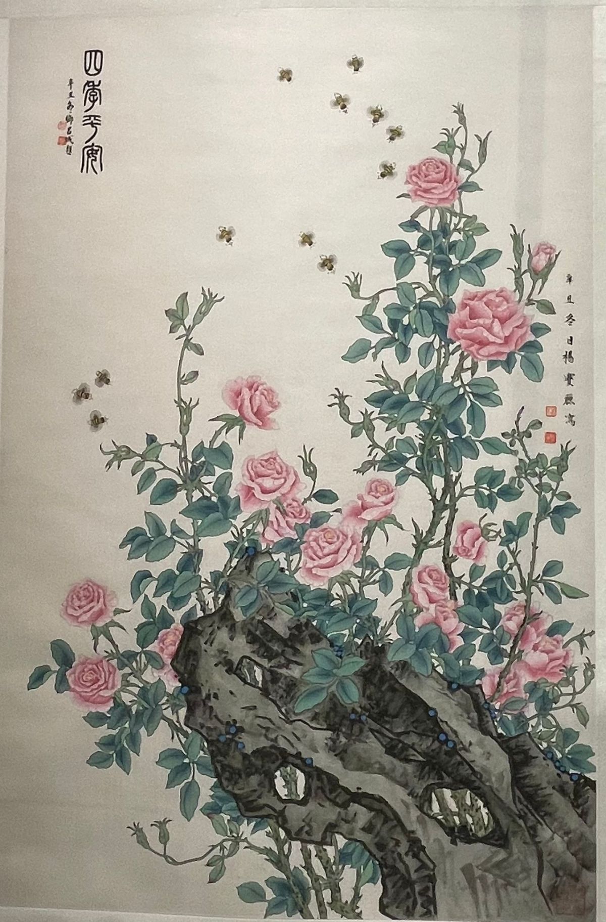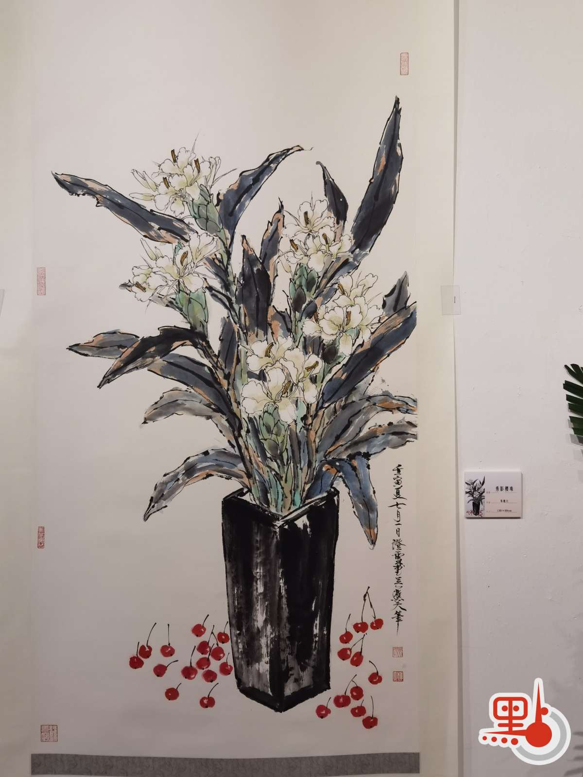 中國香港名家書畫會副會長吳樵六今次亦有兩幅作品展出,分別為《秀影櫻珠》和《年年平安》,其中《年年平安》這幅畫,幾朵蓮花插在水瓶中,希望疫情盡快過去,人人平安。而另一幅《秀影櫻珠》更是別具用心地以25朵姜花和25粒櫻桃,慶祝香港特區回歸祖國25周年。作為香港女中國書畫家協會的倡議者,吳樵六回憶當年在北京教書時,被問到香港有哪些著名女畫家,意識到本港女性畫家缺乏交流切磋藝術和展出作品的平台,倍感可惜,於是聯絡本港幾個團體,共同創立協會。