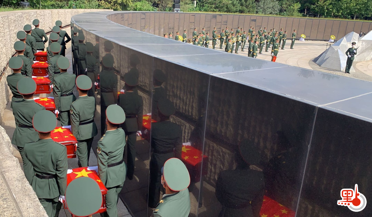 陵園的下沉式紀念廣場周圍蒼松含悲、翠柏哭泣。環形的烈士英名牆下擺滿了黃白相間的菊花。上午10時,儀式正式開始。軍樂隊奏響婉轉的《思念曲》,在解放軍戰士持槍護衛下,禮兵護送志願軍烈士棺槨緩緩步入現場,全場奏唱中華人民共和國國歌。