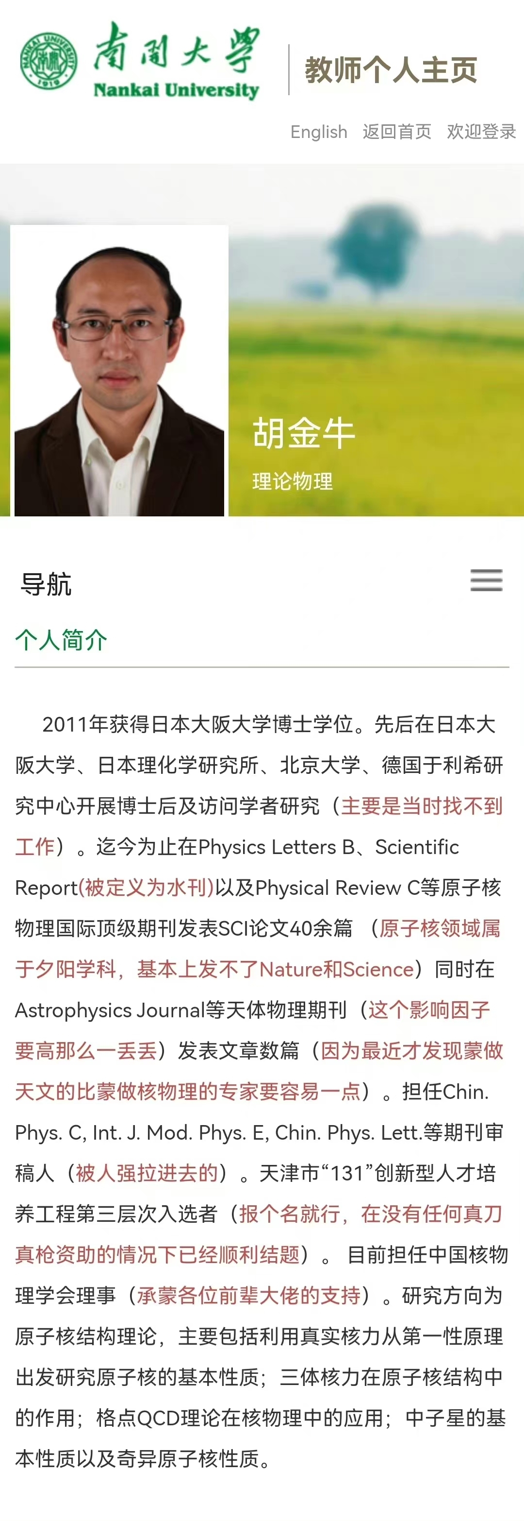 點新聞記者注意到,胡金牛不僅在個人簡介中「真誠坦白」,在研究方向、教學經歷和榮譽稱號方面也「坦誠相待」。例如,在研究方向方面,他寫道:原子核結構中的第一性原理計算 (目前比較火);奇異原子核的基本性質(實驗比較少,可以隨便忽悠) ;原子核結構的質量(原子核物理中的大數據);夸克結構對原子核性質的影響(這個不好說);中子星的基本性質(目前更火的,黃金時代);機器學習在原子核結構中的應用 (目前火得一塌糊塗,其實都是為了生存)。