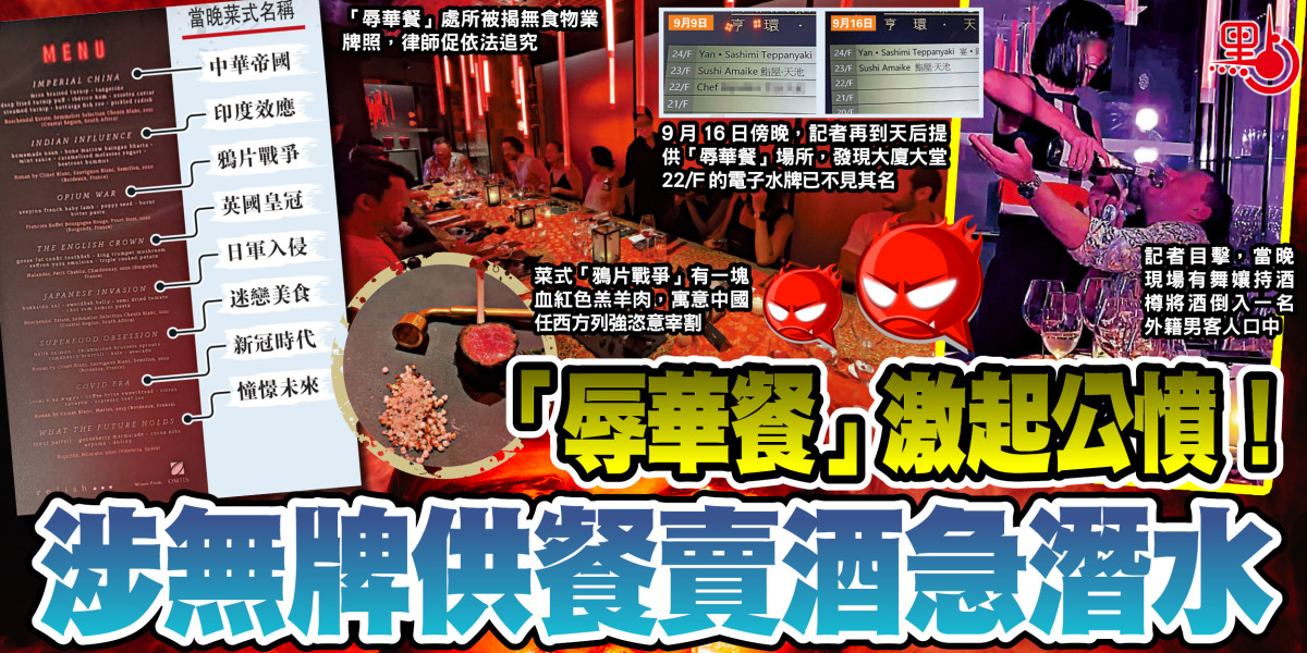 有餐飲公司早前被揭大搞「辱華餐」!這個名叫「Once Upon a Time in Hong Kong」(曾幾何時的香港)、每位收費高達3200元的主題晚餐,多道菜式名字以近代中國的屈辱史作賣點,包括「鴉片戰爭」、「日軍入侵」等,在中國人傷口灑鹽,激起公憤!涉事餐飲公司聲稱當晚是私人活動,不受餐飲業防疫條件規限。不過有律師指出,晚餐食客大多互不認識,已非私人聚會,且公開收錢,涉及商業營運,建議執法部門調查及掃蕩。