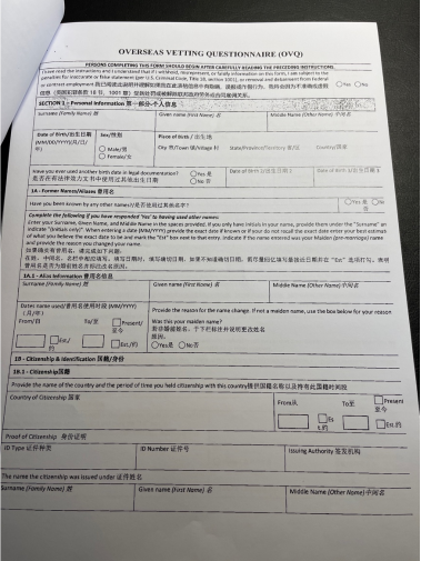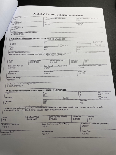 記者近日獲得的一份名為《海外背景調查問卷》(Overseas Vetting Questionnaire)的表格,即為李明和趙平提到的「安全背景調查」的重要內容。該表格分為「填表說明」和「正式表格」兩部分,其說明部分一方面提到「提供信息為自願行為」,卻緊接着出現一段頗具威脅意味的文字:「但如果您不提供所需的相關信息,您的背景調查將無法完成,由此會影響您獲得聯邦合同僱傭關係或相關需要一定邏輯能力以及身體素質才能獲取的權限……故意隱瞞、誤報,提供虛假信息將影響您獲取或延續聯邦合同僱傭關係……還將導致對您的職業發展、工作狀態產生負面影響,包括但不限於解除僱傭關係或被起訴。」