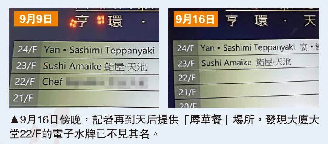 近日,記者再到當日晚餐場所了解,大廈水牌已不見相關公司的名字,另外該餐飲公司的「辱華餐」網頁亦已悄悄刪除。