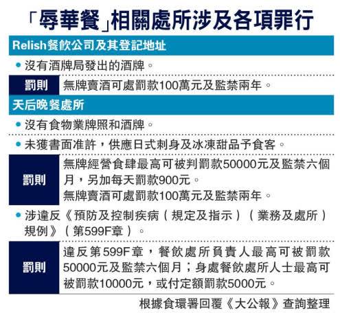 本月10日,《大公報》揭發有餐飲公司大搞「辱華餐」,報道引起廣泛關注。食環署證實,報道中有關晚餐的處所及涉事的餐飲公司均無酒牌,而提供晚餐活動的處所更無食物業牌照。