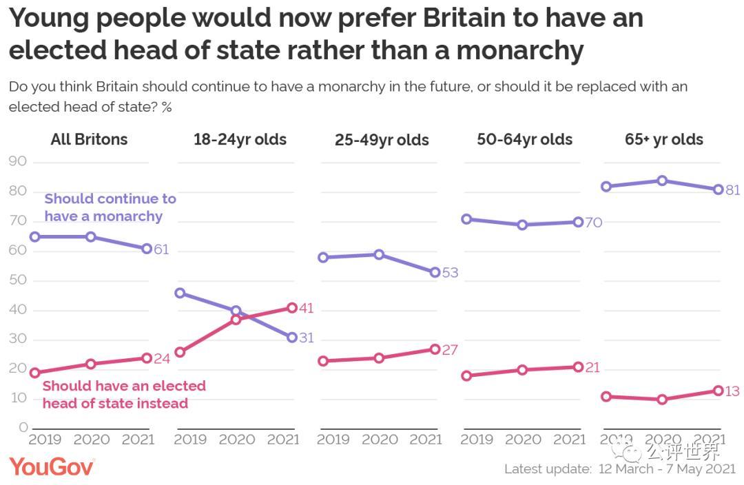 女王對政治問題不輕易發表看法,在位70年只發表過為數不多的全國性講話,可見她惜字如金,不輕易得罪人,女王的存在本身就是英國軟實力的重要延伸。雖然廢除王室的聲音存在了許多年,但從目前來看,英國希望保留王室的還是佔多數。在可預見的未來,英國王室這套制度在英國仍會存在下去,哪怕出於旅遊和觀光的需要。不過,年輕一代與老一代的想法有所不同。特別是千禧一代,他們更願意走向共和制,在18至24歲的年輕群體中,認為君主制對國家有利的只有24%。他們一直在問,為什麼在英國可以允許生而不平等?為什麼允許一幫養尊處優的人的存在?這難道是民主制的一部分嗎?許多年輕家長也在抱怨,他們在教育孩子方面,面臨很大的困擾。
