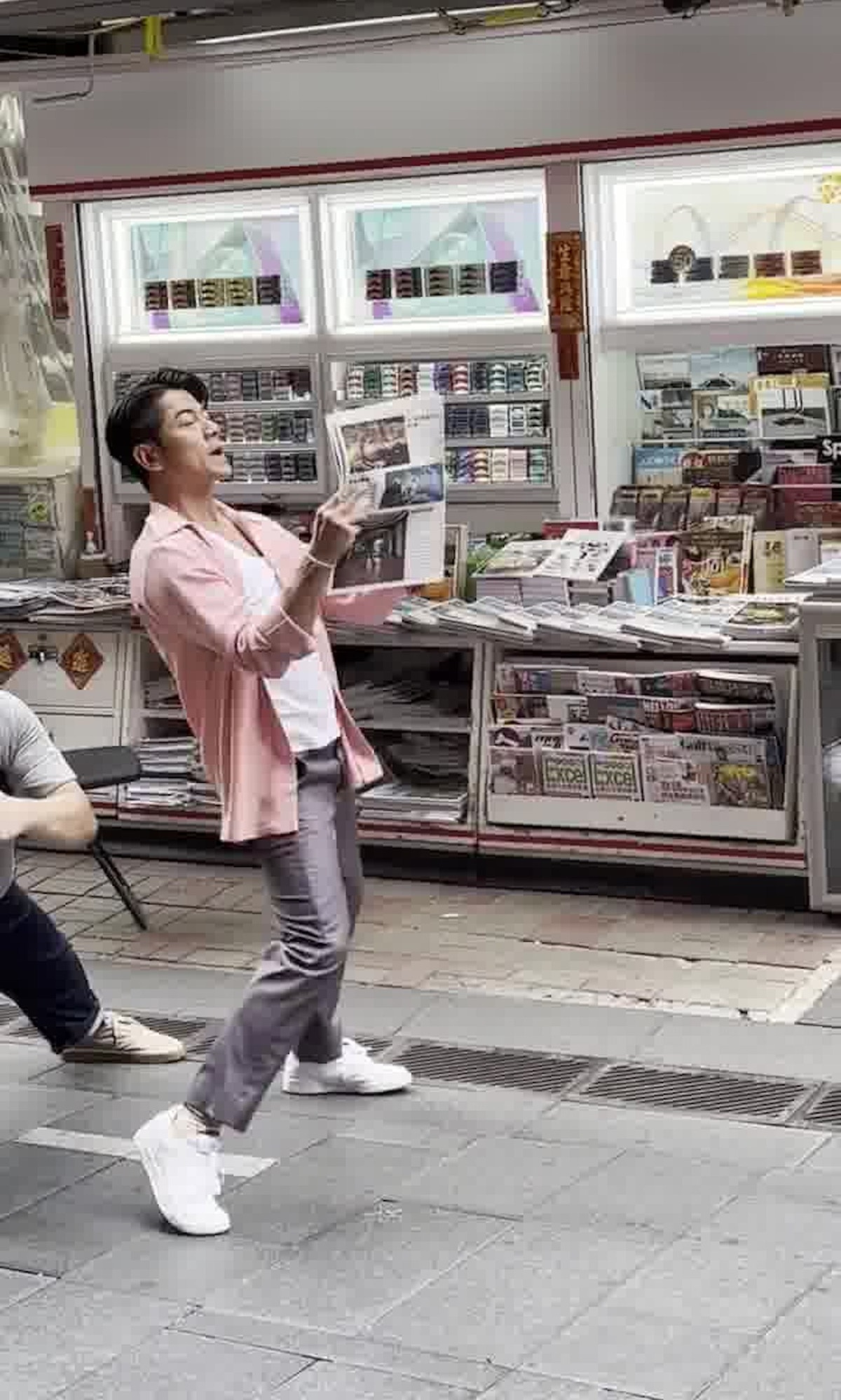 藝人郭富城近年專注在電影圈打拚,許久未上台跳舞唱歌,令不少人很想念他的跳唱表演。有網民今日(21日)在街頭偶遇郭富城,發現他在一個報紙檔前突然大騷舞技,似乎因為太長時間沒有表演跳舞而技癢。