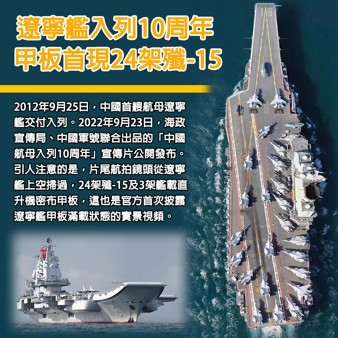 2012年9月25日,中國首艘航母遼寧艦交付入列。2022年9月23日,海政宣傳局、中國軍號聯合出品的「中國航母入列10周年」宣傳片公開發布。影片以遼寧艦走向深藍,山東艦入列、福建艦下水的非凡十年為主線,遼寧艦正副艦長、航母戰鬥機英雄試飛員、航母編隊指揮所某中心主任、艦載機飛行教官、艦載戰鬥機飛行員、艦載機某試訓基地司令員、遼寧艦軍士區隊長、遼寧艦機電部門班長、遼寧艦系留員、南昌艦政委、福建艦某中隊長,以及先後在遼寧艦、山東艦、福建艦三艘航母工作過的一級上士,先後講述了十年來中國航母逐夢海天的故事。引人注意的是,片尾航拍鏡頭從遼寧艦上空掃過,24架殲-15及3架艦載直升機密布甲板,這也是官方首次披露遼寧艦甲板滿載狀態的實景視頻。