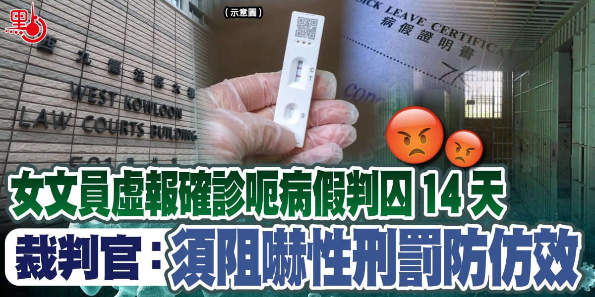 一名女文員在今年3月上載假快測結果報稱染疫,在衞生署抽樣檢查證實她無確診後,又改稱沒有上報資料,在警方調查後承認有提交相關快測結果,被控明知而向衞生主任提供虛假資料等兩罪,昨日西九龍裁判法院認罪。裁判官施祖堯指出,被告為了取得病假而干犯控罪,加上屬有計劃犯案,甚至在衞生職員查問下仍說謊,可能會增加醫療系統的壓力,故判其監禁14天。