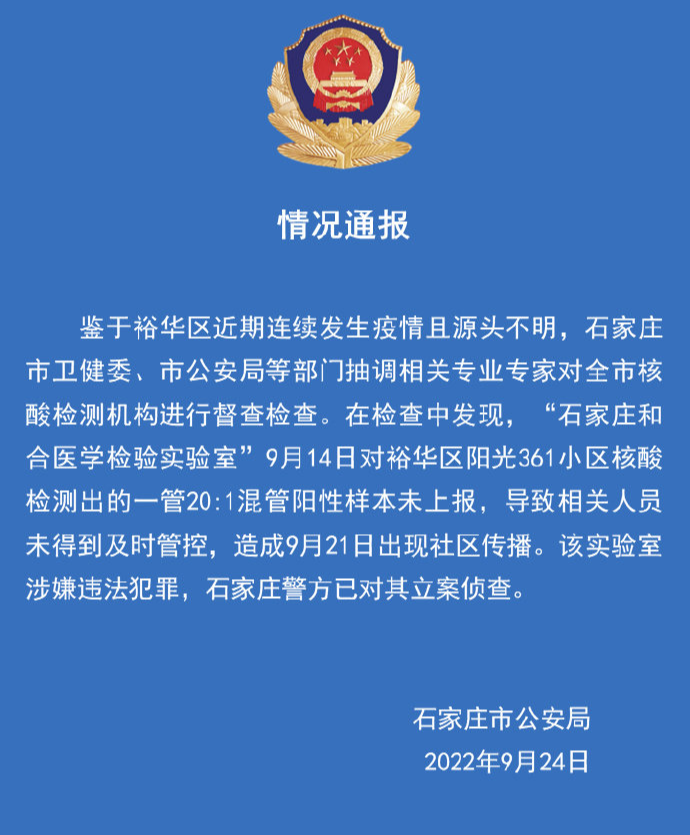 今日(24日)傍晚,石家莊市公安局發布通告稱,鑒於裕華區近期連續發生疫情且源頭不明,石家莊市衞健委、市公安局等部門抽調相關專業專家對全市核酸檢測機構進行督查檢查。在檢查中發現,「石家莊和合醫學檢驗實驗室」9月14日對裕華區陽光361小區核酸檢測出的一管20:1混管陽性樣本未上報,導致相關人員未得到及時控,造成9月21日出現社區傳播。