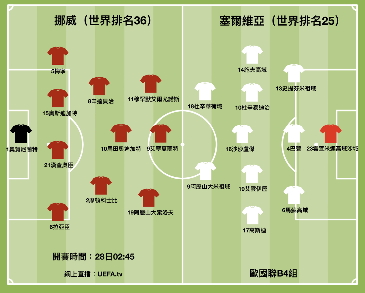 正當歐國聯A級賽事準備決出4支參加明年決賽周的隊伍之際,其他級別的升降形勢亦漸趨明朗,B4組的挪威與塞爾維亞在最後一輪賽事交鋒,在對賽往績較佳的挪威今仗坐和望贏下,甚有可能繼續力壓對手出線,在「狂鋒」艾寧夏蘭特帶領下,「扶搖直上」連續兩屆都能夠升班揚威。(香港時間周三凌晨2時45分開賽,UEFA.tv直播賽事)