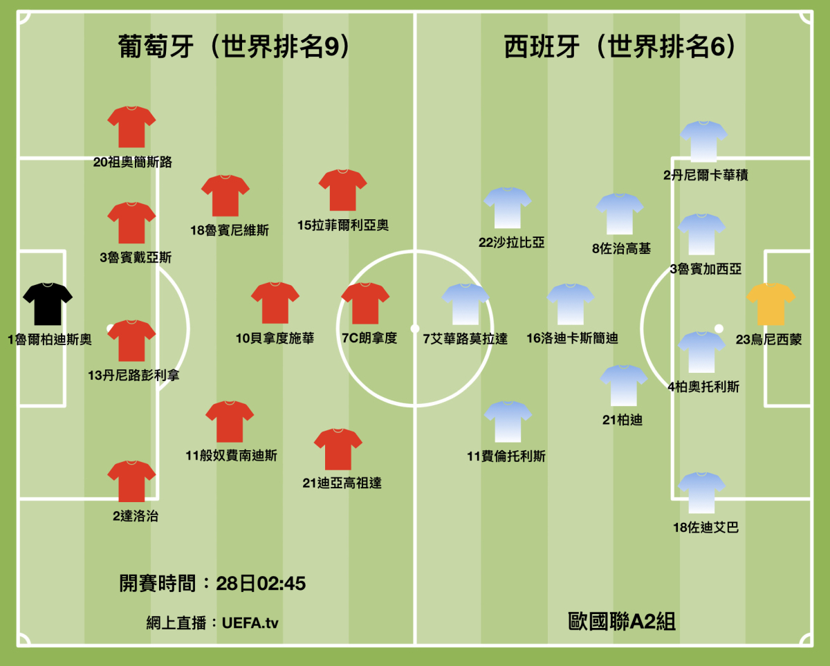 葡萄牙與西班牙將在歐國聯A2組最後一輪賽事交鋒,爭奪出線4強決賽周資格。葡萄牙一眾主將如C朗拿度、般奴費南迪斯、達洛治、祖奧簡斯路等無論在球會抑或國際大賽均有回勇跡象,甚有機會在這場矚目交鋒中「剝牙」擊退「鬥牛士」殺出重圍。(香港時間周三凌晨2時45分開賽,UEFA.tv直播賽事)