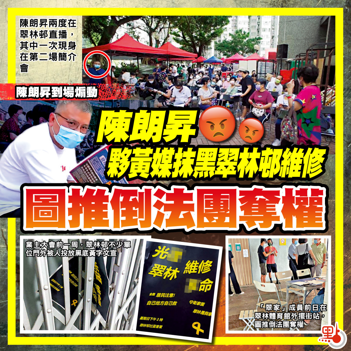 陳朗昇任職由前《蘋果日報》員工開設的網媒《Channel C》,聯同其他黃媒鼓吹「自己屋苑自己救」,渲染翠林邨維修工程的爭議,誣衊現屆法團誠信。記者翻查《Channel C》節目,陳朗昇在法團舉行的其中兩場居民簡介會做直播,陳屢用「天價工程」煽惑居民。而已滲入屋苑的「翠家」實行裏應外合夾擊法團,在舉行業主大會前,「翠家」在其社交平台聲稱法團義工洗樓要業主「簽授權書」,《Channel C》則助攻訪問「翠家」成員添油加醋。翠林邨業主大會在上月21日舉辦,陳朗昇在當日做直播繼續煽風點火抹黑,又稱「排隊耐入唔到場」云云,攻擊法團及保安當日安排失當。