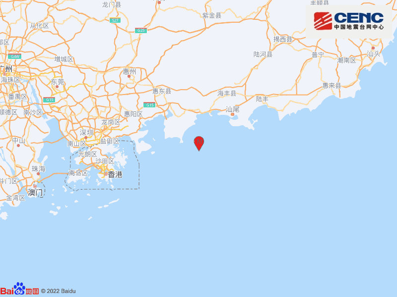 據中國地震台網正式測定,今日(27日)晚上7時54分在廣東惠州市惠東縣海域(北緯22.50度,東經115.07度)發生3.2級地震,震源深度24千米。