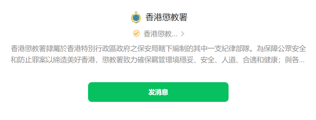 懲教署表示,將利用微信官方賬號發布該署在羈管工作、更生計劃及社區教育等範疇的資訊,除了提供多一個渠道讓香港市民了解懲教署工作及發展外,更藉着拓寬信息發布的渠道,向內地民眾推廣該署工作,加強兩地的聯繫和互動。公眾由今日起可於微信搜尋「香港懲教署」關注官方賬號。