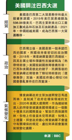 BBC指,由於美巴政經聯繫緊密,華府一向關注巴西大選,不同的是這次很多美國官員提前幾個月就開始談論此事。這是因為博索納羅與美國前總統特朗普的相似性,令美國民主黨政府有所警惕。美國和巴西面臨着同樣的挑戰,例如大量新冠死亡病例和高通脹率,如今2021年1月6日美國國會暴亂也可能在巴西重演。