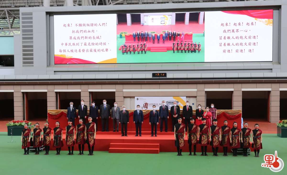國慶賽馬日今日(10月1日)在沙田馬場上演,開幕匯演於馬匹亮相圈舉行。香港中聯辦宣傳文體部副部長張國義、香港賽馬會主席利子厚及一眾董事一同為開幕儀式主禮。