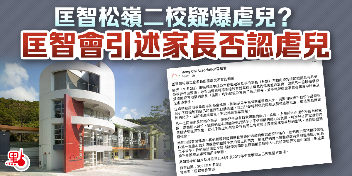 辦學團體匡智會今日在FB專頁發聲明,指昨日(2日)傳媒報道中提及該校學童被紮手的家長(丘媽),主動向校方提出認為有必要為學校作出澄清。她指傳媒報道指控校方對其孩子造成的傷害並非真實,她與另一位聯絡學校望協助校方澄清的家長(昆媽),均對學校及其員工表示信任,並不懷疑學校裏曾有報道中所提及之虐待事件。