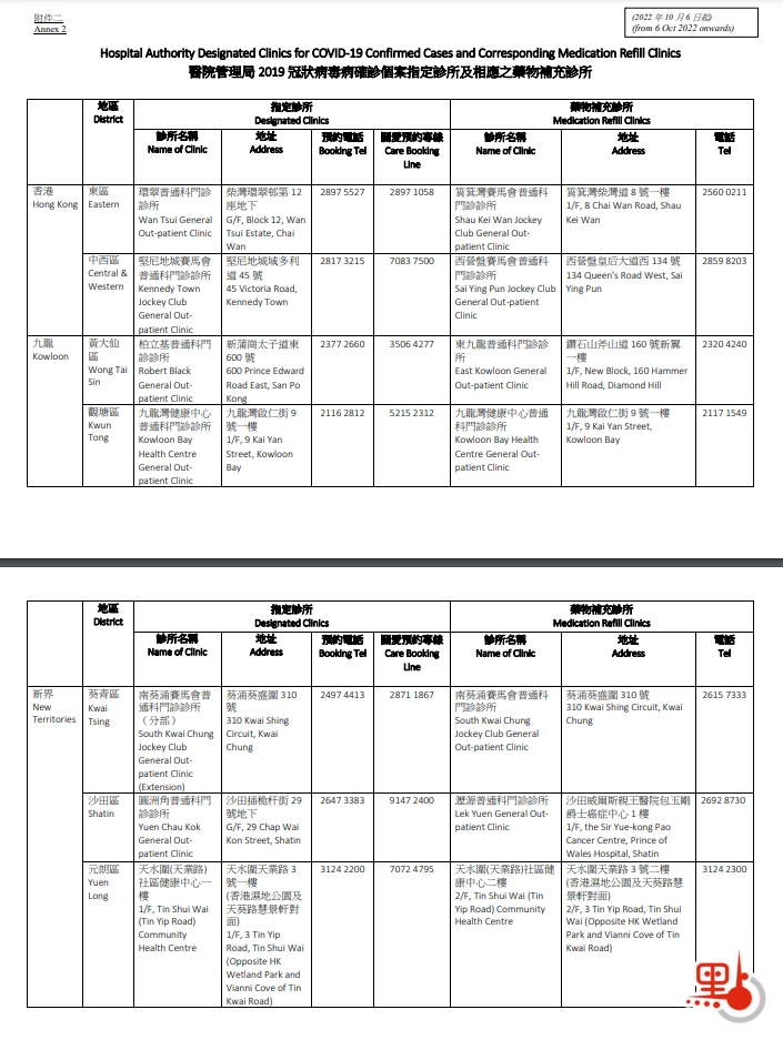 醫院管理局發言人今日(3日)宣布,位於中九龍診所的新冠確診個案指定診所,將於10月6日(星期四)起停止服務,並於10月7日(星期五)起恢復普通科門診診所服務。普通科門診診所亦會於10月7日起恢復部分早前暫停的服務,包括星期日及公眾假期以及夜間門診服務。