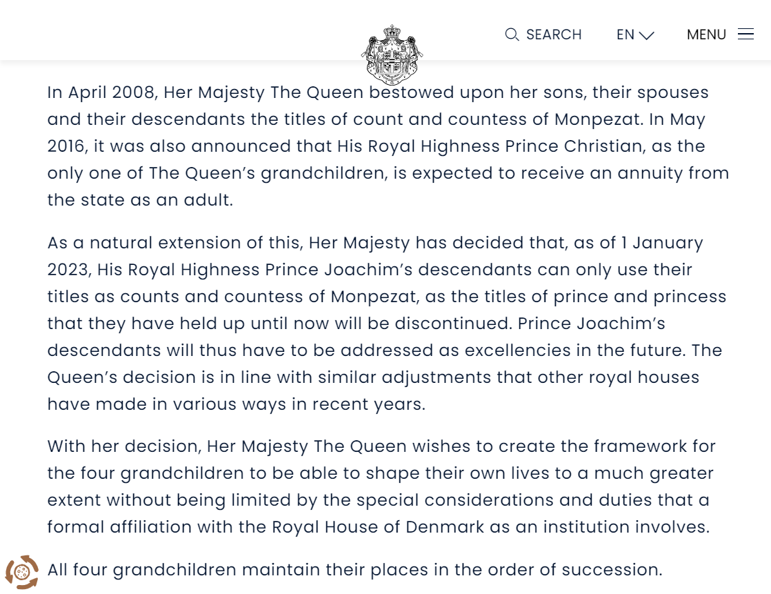 瑪格麗特二世表示,這個決定是她作為女王、母親及祖母的身份而作出,但作為母親及祖母,低估決定對幼子及其家人造成的影響程度,對此感到抱歉。她希望丹麥皇室「與時並進」,而她上周公布的決定其實已經考慮很久,目的是要現行的君主制度「面向未來」,故收回頭銜是必須作出的艱難決定。