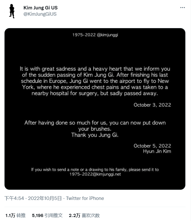 韓國知名藝術家金政基(Kim Jung Gi)的官方賬號,於今日(5日)下午發布公告,表示他已於10月3日離世,得年47歲。