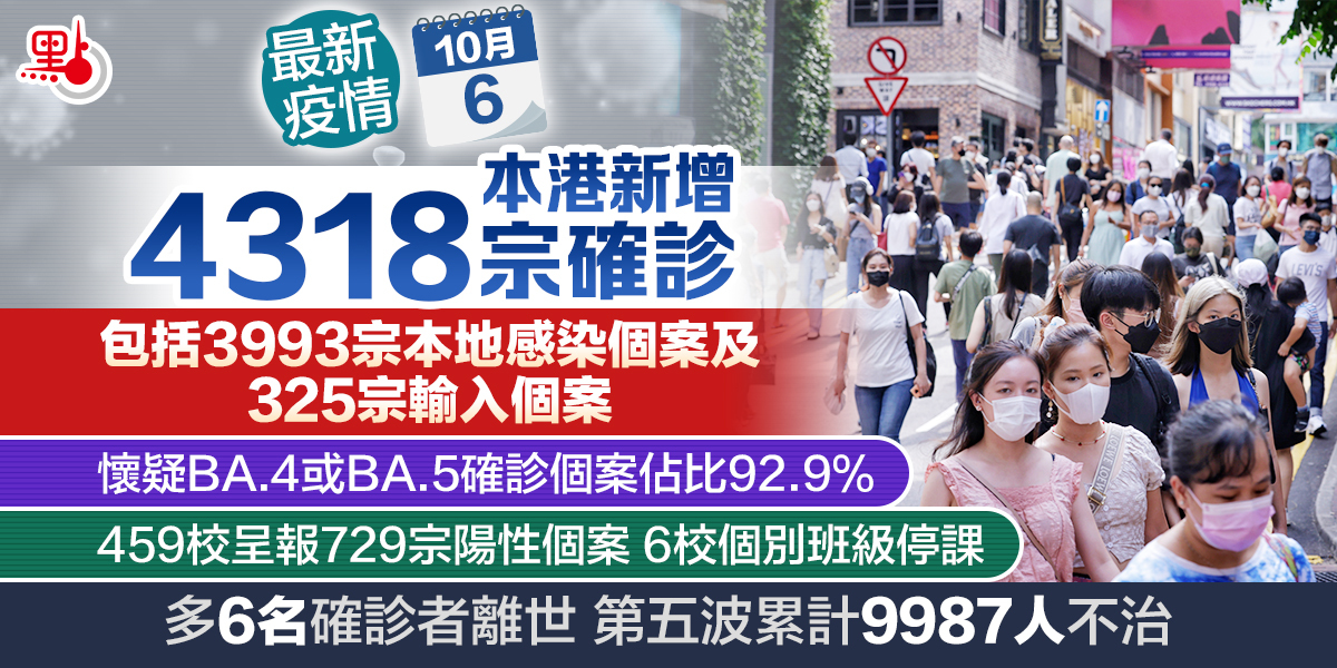 本港第五波疫情持續,衞生署衞生防護中心公布,截至今日(6日)零時,本港過去一日新增4318宗確診個案,當中包括3993宗本地確診個案及325宗輸入個案。本地確診個案中,核酸檢測陽性個案1075宗,快測陽性個案2918宗。