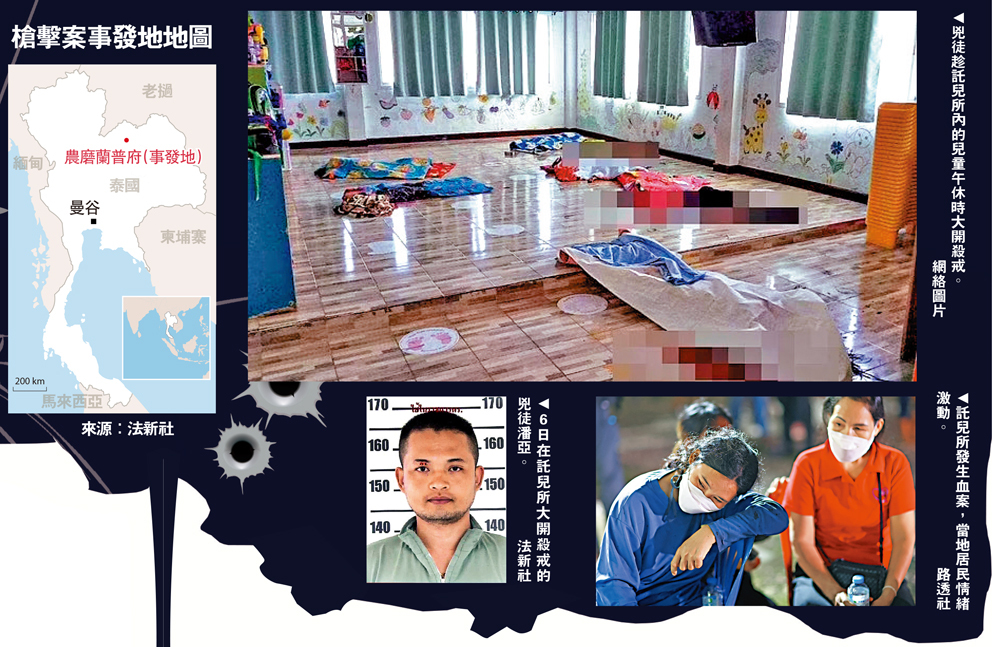 泰國昨日(6日)發生歷來傷亡最嚴重的槍擊案,一名因涉毒被革職的前警員闖入一家託兒所,開槍及用刀殺死多名師生後,再開車瘋狂追撞途人,最後回家殺死妻兒後自盡。泰國政府今日(7日)為東北部農磨蘭普府幼兒園惡性傷害事件的遇難者舉行悼念儀式。