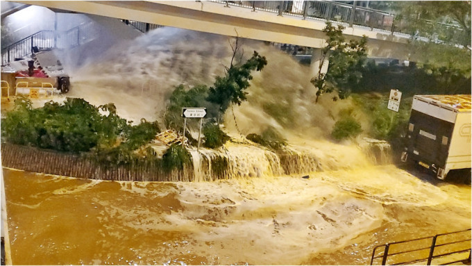 長沙灣東京街近荔枝角道今日(8日)凌晨爆水管,大量鹹水沿天橋底花槽湧出馬路,出現壯觀的城市「大瀑布」奇景。