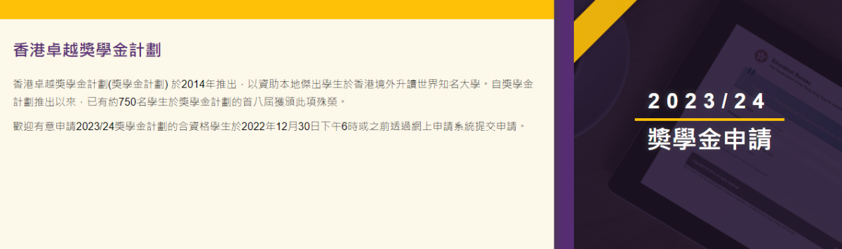 教育局宣布,香港卓越獎學金計劃(獎學金計劃)由今日(11日)起至12月30日接受申請。有意於2023/24學年起入讀香港境外世界知名大學的學士學位或研究院課程的合資格香港學生均可申請。