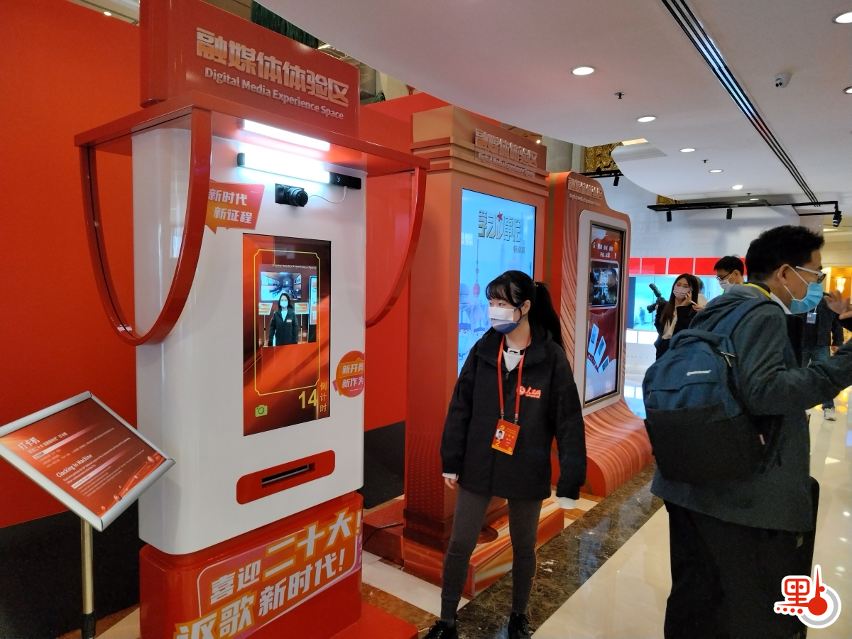 融媒體體驗區科技感十足,多面照片牆多角度展示中國近年來的發展,每張照片右下角還附有二維碼,觀眾可以用手機掃碼睇片,看影像裏的新時代。