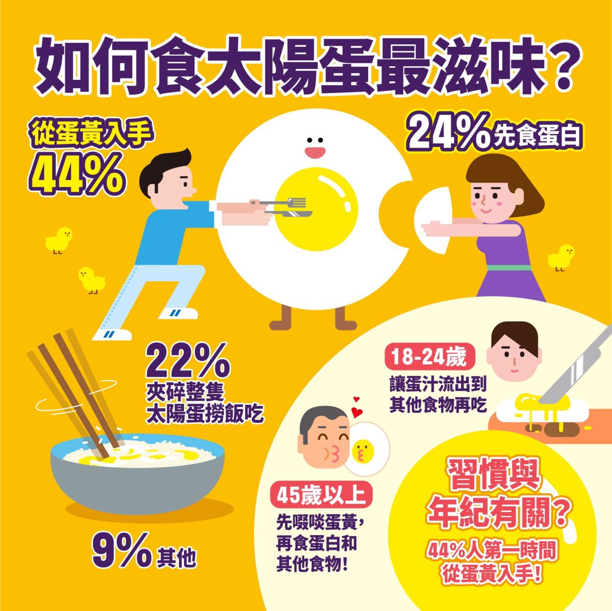 太陽蛋是飯桌上「常岀現的食物」,早晨茶記甚至午飯都會吃,中、日、韓、泰等菜式總會見到蛋的「身影」。一碗白飯配上一隻脆邊荷包蛋,蛋汁與豉油流滲而下,因為熟飯的溫度而變成半生熟狀態,加上豉油微微減去雞蛋的腥味,又能發揮雞蛋的最大美味。港人食太陽蛋逾4成人會率先從蛋黃入手,當中越年輕的受訪者,越喜歡用筷子篤穿蛋黃,相反45歲以上的受訪者則會第一時間先啜蛋汁,率先享受蛋汁濃郁滑順的口感。而第二和第三名分別是先吃蛋白(24%),和攪碎整隻太陽蛋,與飯或麵撈勻再一次過吃(22%)。一隻太陽蛋能為港人每餐畫龍點睛,深得大家歡心。