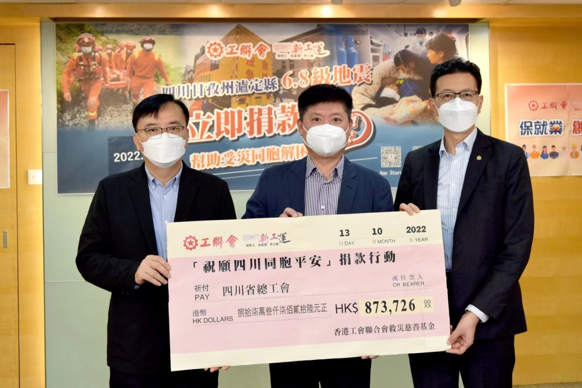 四川省甘孜州瀘定縣於9月5日發生6.8級地震之後,工聯會發起全港籌款活動,截至10月初籌得善款超過873726港幣。工聯會會長吳秋北、理事長黃國今日(13日)將籌得的善款支票,交予中聯辦社工部副部長周蔚代為轉交給四川省總工會,協助救濟及災區重建工作,這是工聯會就瀘定縣地震遞交的第二筆賑災捐款,包括工聯會較早前捐出20萬元,以及今次外界募捐87萬多元,合共捐款超過100萬元。