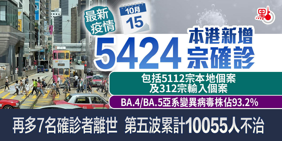 本港第五波疫情持續,衞生署衞生防護中心公布,截至今日(15日)零時,本港過去24小時新增5424宗確診個案,當中包括5112宗本地個案及312宗輸入個案。本地確診個案方面,包括1312宗核酸檢測陽性個案以及3800宗快速測試陽性個案。