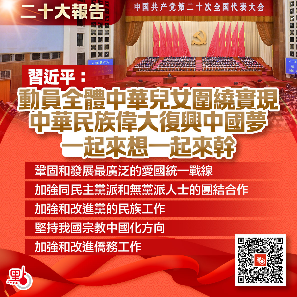 中國共產黨第二十次全國代表大會今日(16日)上午10時在人民大會堂開幕。習近平代表第十九屆中央委員會向大會作報告。習近平表示,發展全過程人民民主,保障人民當家作主。鞏固和發展最廣泛的愛國統一戰線,完善大統戰工作格局,堅持大團結大聯合,動員全體中華兒女圍繞實現中華民族偉大復興中國夢一起來想、一起來幹。