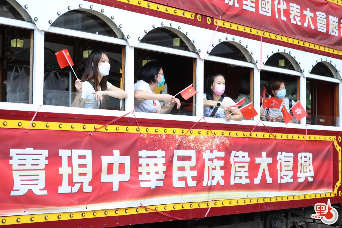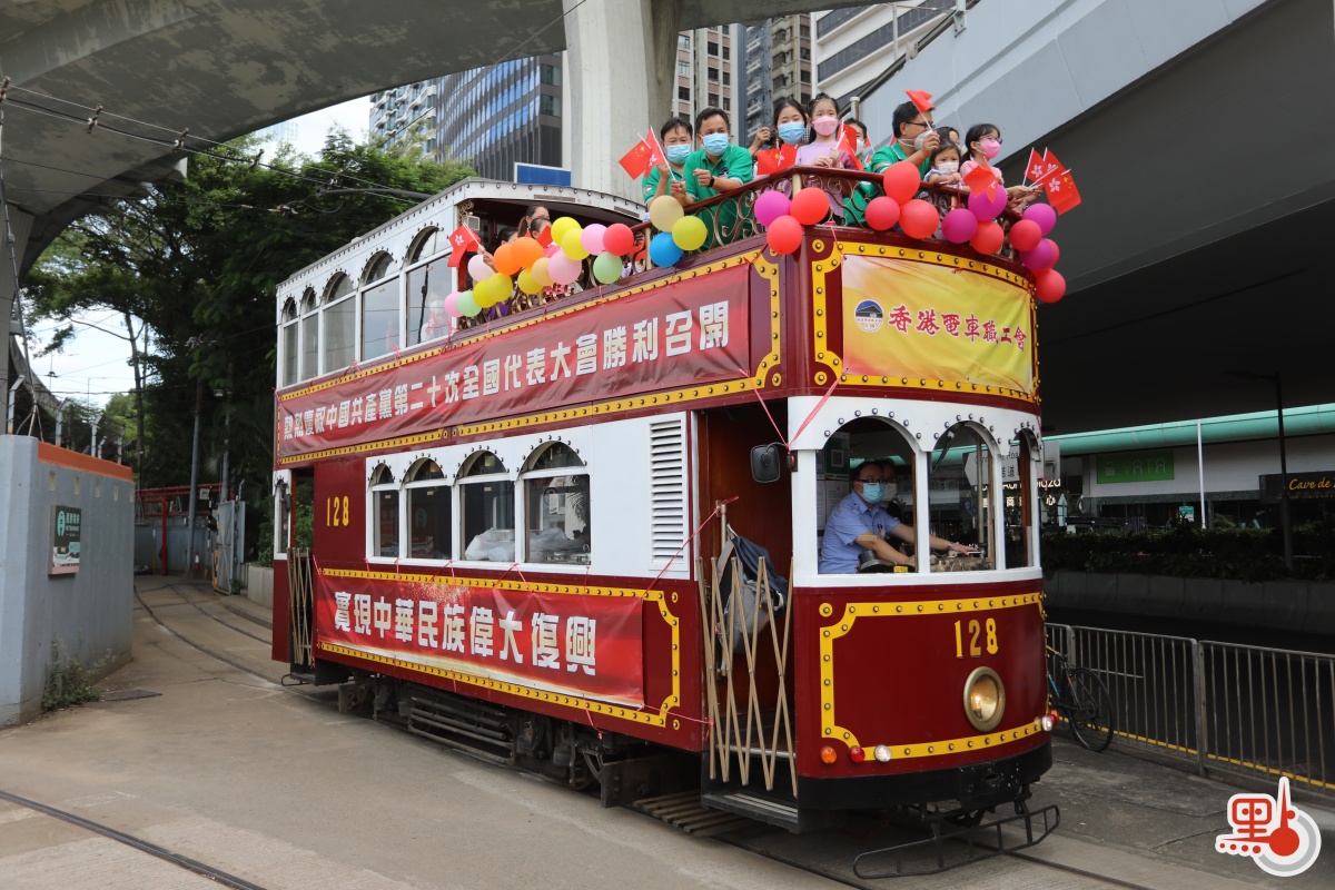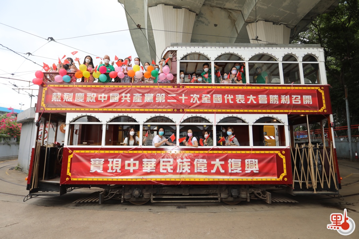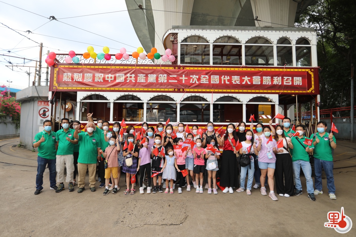 為慶祝中國共產黨第二十次全國代表大會在北京人民大會堂開幕,香港電車職工會今日(16日)組織逾20名市民和孩子乘坐電車在港島巡遊。