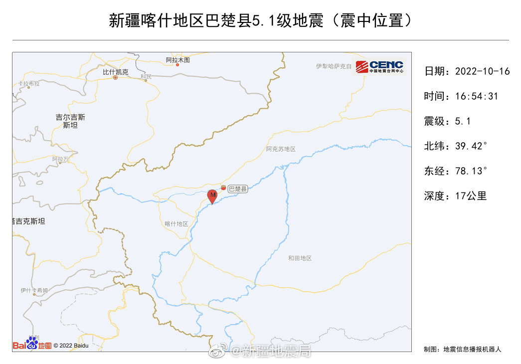 據中國地震台網正式測定,今日(16日)16時54分在新疆西南部的喀什地區巴楚縣發生5.1級地震,震源深度17千米,震中位於北緯39.42度,東經78.13度。截至記者發稿,尚未有人員傷亡報告。
