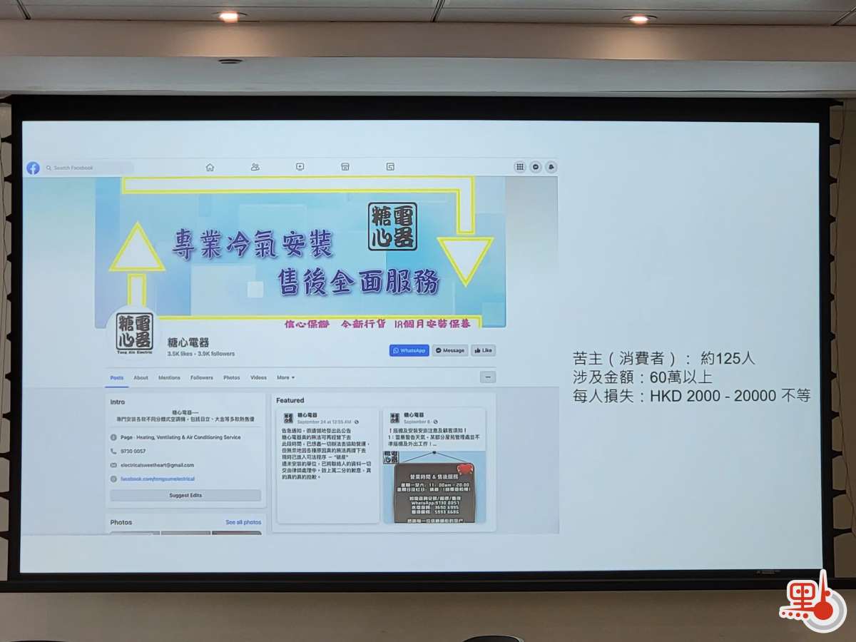 民建聯葵青區議員郭芙蓉表示,接獲逾125名市民求助,指在同一網上商店「糖心電器」訂購冷氣機及安裝服務,可是公司突然宣告破產結業,自此失去聯絡,顧客損失由2千元至2萬元不等,合共60多萬元。他們指海關上周已經拘捕了涉事店舖的負責人,相信案件已進入調查的程序,我們將協助更多苦主報案,跟進事件。