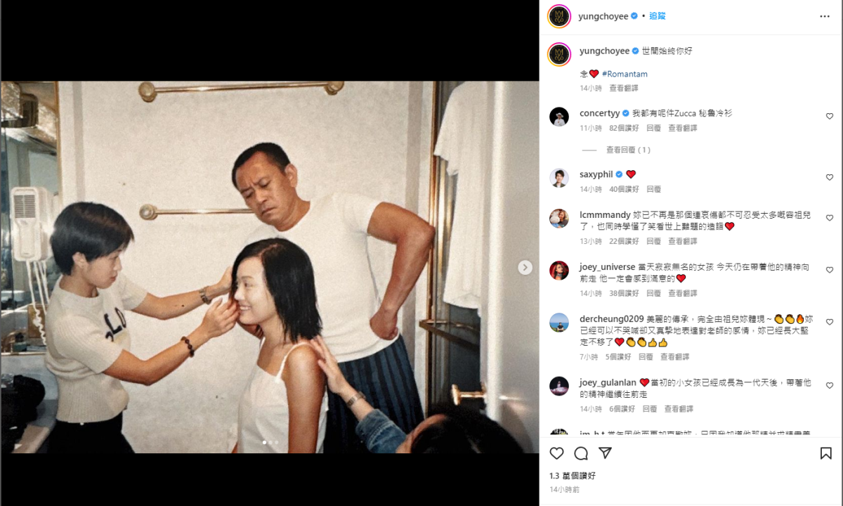 殿堂級歌手羅文逝世20周年。藝人容祖兒今日(18日)凌晨時分,在社交平台貼出3張她初入行時與羅文的舊合照,緬懷過去寫道:「世間始終你好」。