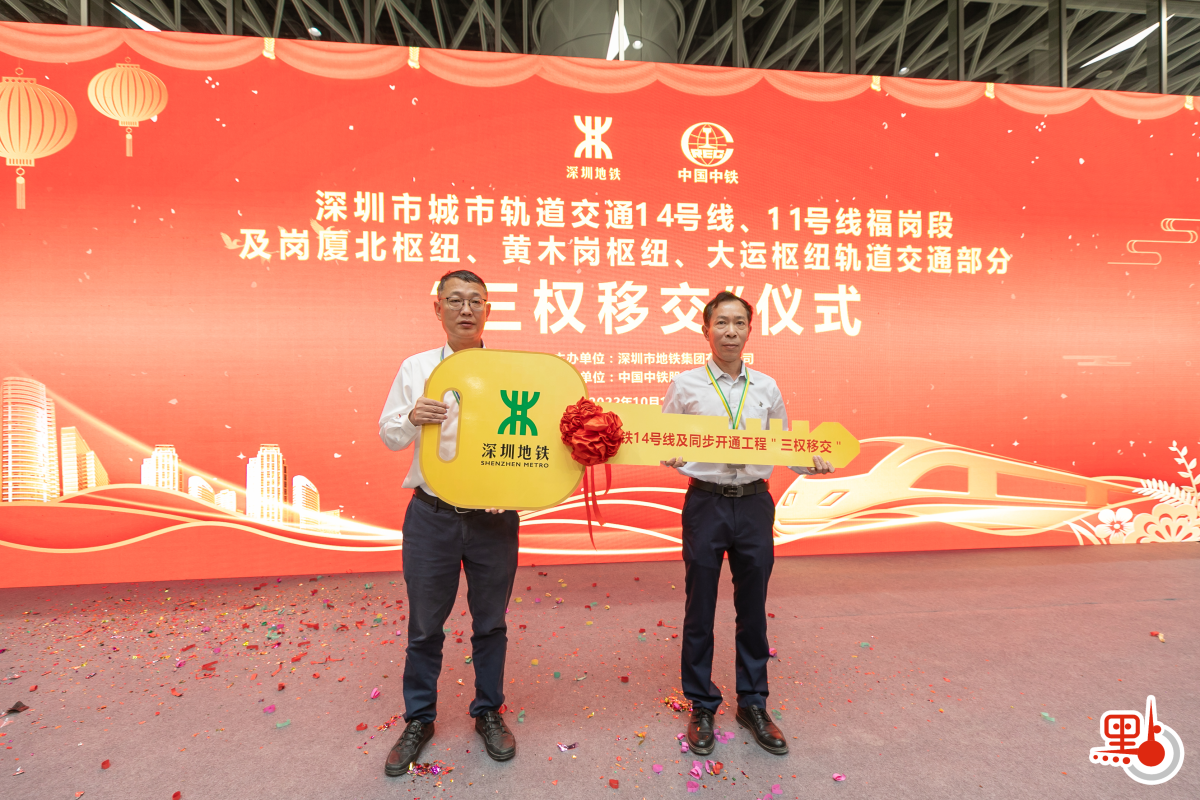 10月18日,深圳市城市軌道交通四期工程「兩線三樞紐」三權移交儀式在崗廈北樞紐順利舉行。深鐵建設負責人代表將「金鑰匙」傳遞到深鐵運營負責人手中,標誌着深圳地鐵14號線、11號線福田-崗廈北區間及崗廈北樞紐、黃木崗樞紐、大運樞紐正式由建設階段轉為運營籌備階段,計劃月底前開通初期運營,屆時全網將增加3座換乘站點。