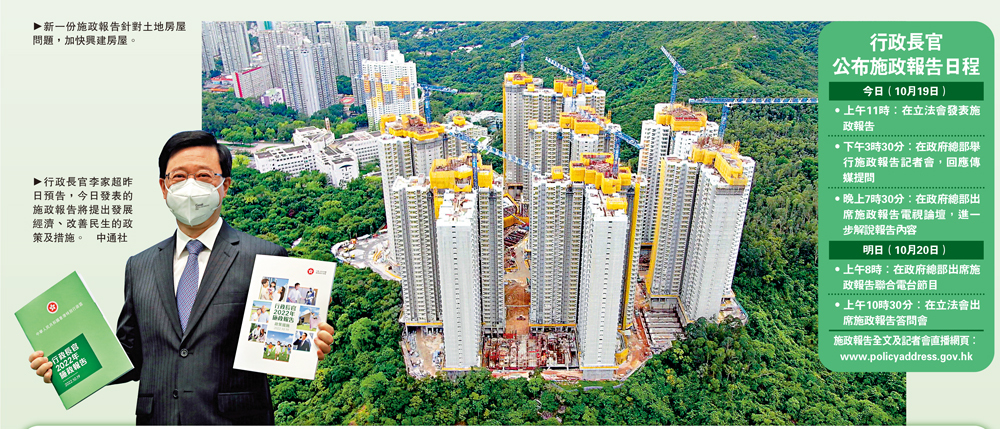 行政長官李家超今日將發表任內首份施政報告,他昨日預告,將提出發展經濟、改善民生的政策及措施,包括針對土地房屋問題、如何增強香港競爭力等。