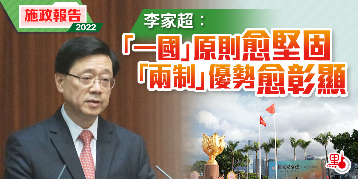 行政長官李家超今日(19日)發表新一屆特區政府的首份施政報告。李家超強調,「一國兩制」是香港長期繁榮穩定的最佳制度保障,維護國家主權、安全、發展利益是「一國兩制」方針的最高原則。「一國」原則愈堅固,「兩制」優勢愈彰顯。