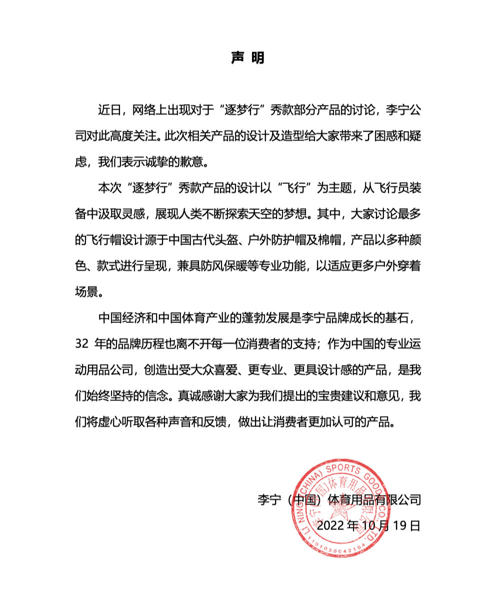 李寧指,「逐夢行」的產品設計以「飛行」為主題,其中大家討論最多的飛行帽設計源於中國古代頭盔、戶外防護帽及棉帽,產品以多種顏色、款式進行呈現。聲明強調,李寧作為中國專業運動用品公司,創造出受大眾喜愛、更專業、更具設計感的產品,是公司始終堅持的信念,將虛心聽取各種聲音和反饋,做出讓消費者更加認可的產品。