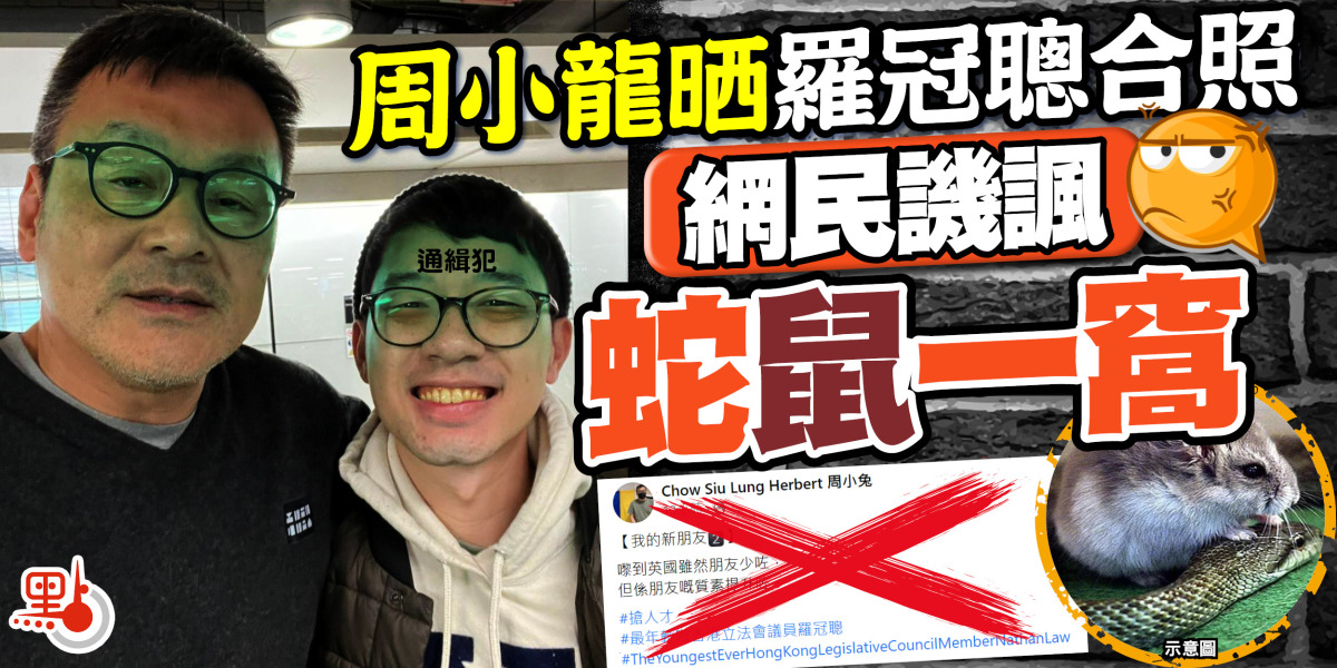 潛逃到海外的亂港分子一直死心不息,走咗佬嘅童裝品牌Chickeeduck 公司老闆周小龍,噚日喺在社交平台晒出一張合照,相中人就係被警方國安處通緝的「香港眾志」創黨主席羅冠聰,仲聲稱對方係「新朋友」㖭,被網民譏諷蛇鼠一窩。