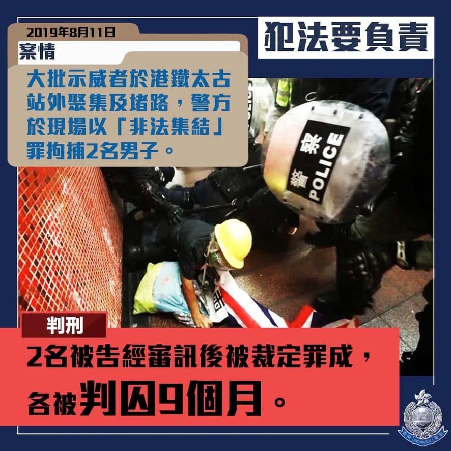 2019年8月11日,大批示威者於港鐵太古站外聚集及堵路,警方於現場以「非法集結」罪拘捕兩名男子。兩名被告經審訊後被裁定罪成,今日(19日)在東區裁判法院各被判囚9個月。