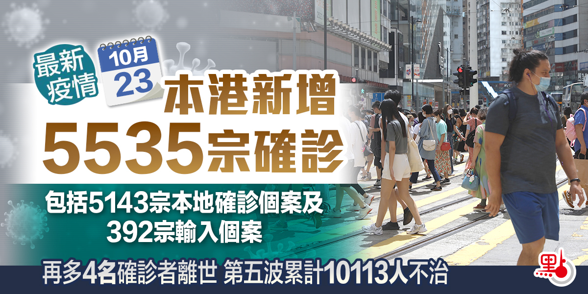 本港第五波疫情持續,衞生署衞生防護中心公布,截至今日(23日)零時,本港過去一日新增5535宗確診個案,當中包括5143宗本地確診個案及392宗輸入個案。本地確診個案中,核酸檢測陽性個案有1350宗,快測陽性個案3793宗。