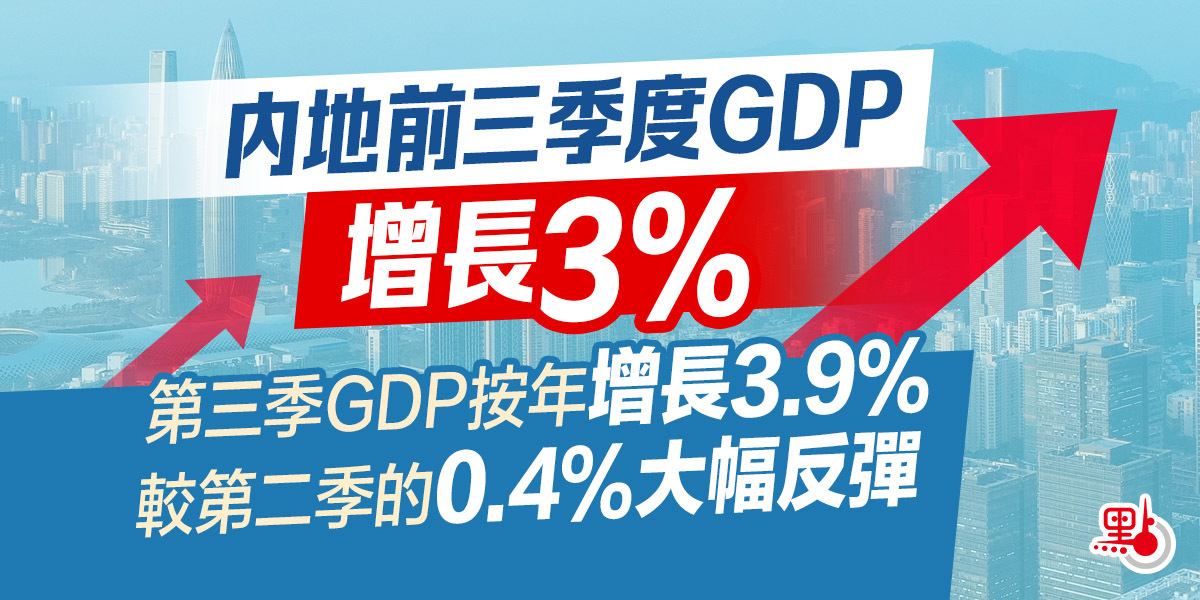 國家統計局今日(24日)公布,初步核算,前三季度內地生產總值870269億元(人民幣,下同),按不變價格計算,同比增長3.0%,比上半年加快0.5個百分點。分產業看,第一產業增加值54779億元,同比增長4.2%;第二產業增加值350189億元,增長3.9%;第三產業增加值465300億元,增長2.3%。分季度看,一季度內地生產總值同比增長4.8%,二季度增長0.4%,三季度增長3.9%。從環比看,三季度內地生產總值增長3.9%。