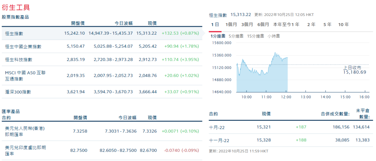 恒生指數今日(25日)早盤低開,曾一度跌穿15000點觀口,低見14947點,隨後倒升,一度升逾200點,高見15435點,截至午市收盤,恒生指數升132點,升幅0.87%,報15313點,成交額849.67億元;恒生科技指數升110點,升幅3.95%,報2912點;國企指數升幅1.78%,報5205點。