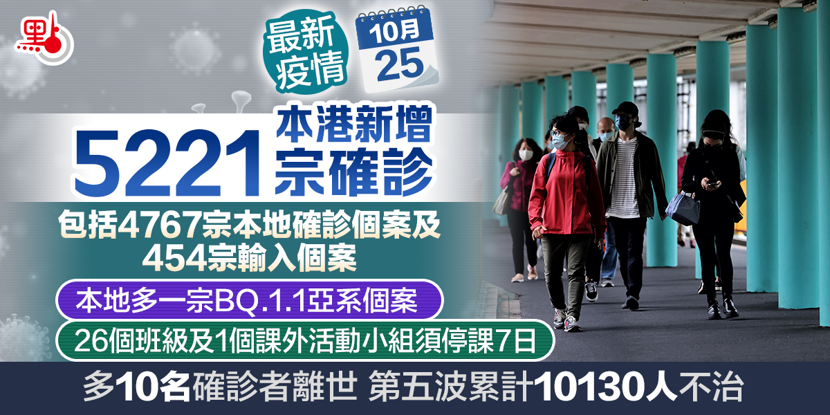 本港第五波疫情持續,衞生署衞生防護中心公布,截至今日(25日)零時,本港過去一日新增5221宗確診個案,當中包括4767宗本地確診個案及454宗輸入個案。本地確診個案中,核酸檢測陽性個案有1183宗,快測陽性個案3584宗。