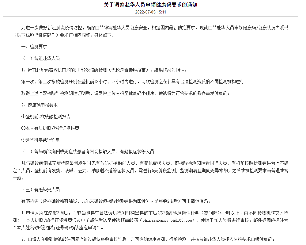 是次中國駐菲律賓大使館更新的《關於調整赴華人員申領健康碼要求的通知》,與早前要求相比,有了以下變動: