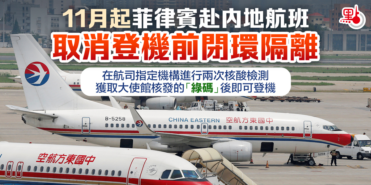 面對疫情的發展,回國政策也在不斷更新。根據東航、南航及廈航最新消息,自11月1日起,搭乘廈航航班自菲律賓赴華的中、外籍旅客統一進行二輪核酸檢測,無需行前酒店閉環管理;11月3日起,南航及東航航班亦進行相同防疫政策調整。搭乘相關航線航班的乘客只需要按照中國駐菲律賓使館的要求,於登機前在航司指定機構進行2次核酸檢測,獲取大使館核發的「綠碼」後即可登機。