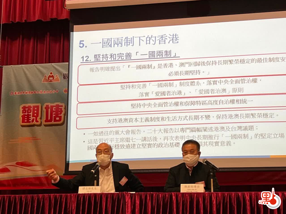 陳振彬和譚志源介紹黨代會的歷史沿革、二十大報告的主要內容,包括回顧過去十年成就、未來新征程的方向、目標及中心任務,亦講解二十大報告提出的多項行動綱領。他們表示,報告明確提出「一國兩制」是香港、澳門回歸後保持長期繁榮穩定的最佳制度安排,必須長期堅持,是習近平主席繼七一講話後,再次表明中央長期推行「一國兩制」的堅定立場。